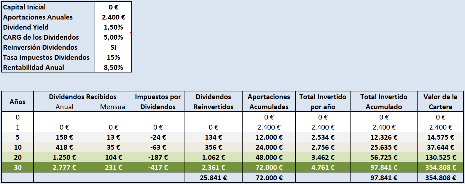 He montado una hoja de Excel para ver qué podría ocurrir en distintos horizontes. El modelo parte de 200€ al mes (2.400€ al año), asume una revalorización media del precio del 8,5% anual y un dividend yield del 1,5% que crece un 5% al año.