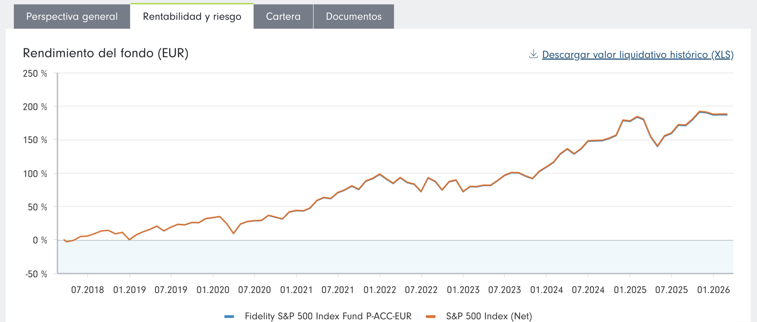 Y si se observa el gráfico de la propia gestora, se aprecia que el fondo sigue al índice con bastante precisión: sube y baja prácticamente igual, con las pequeñas diferencias normales derivadas de comisiones y ajustes internos.