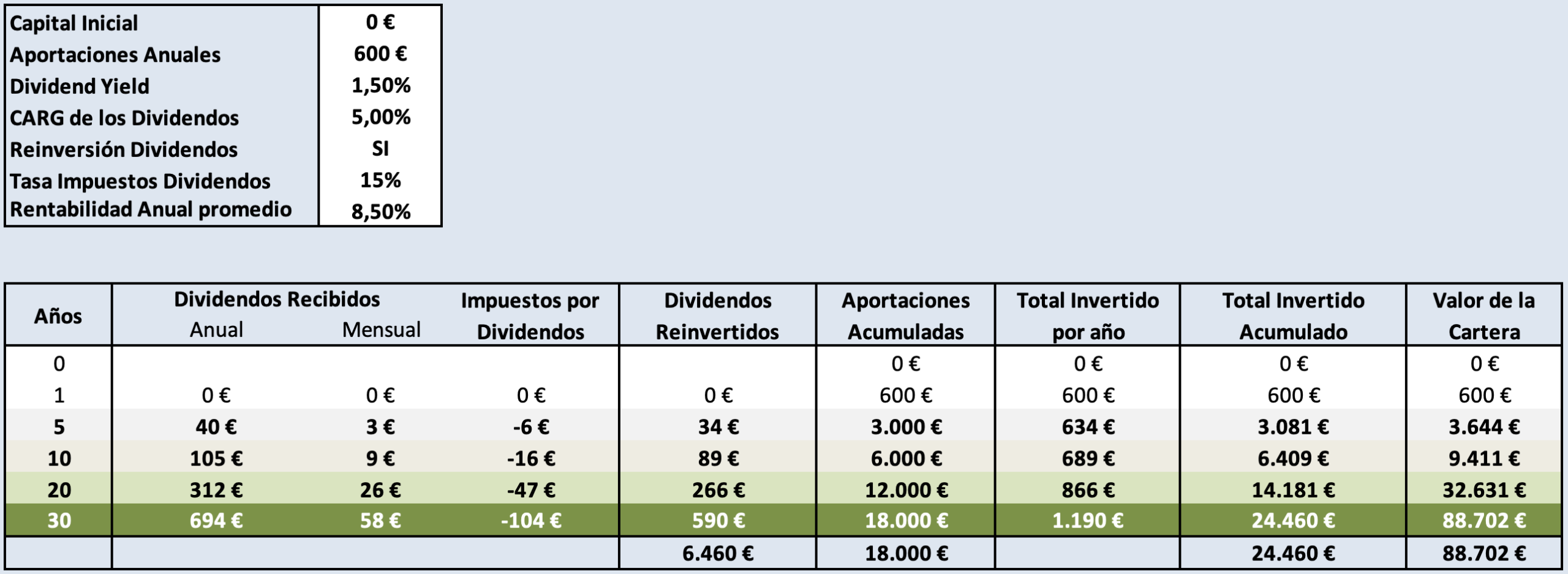 - Y cuando su hija cumpla 30 años, Alex habría aportado en total 18.000€, pero la cartera tendría un valor de 88.702€.