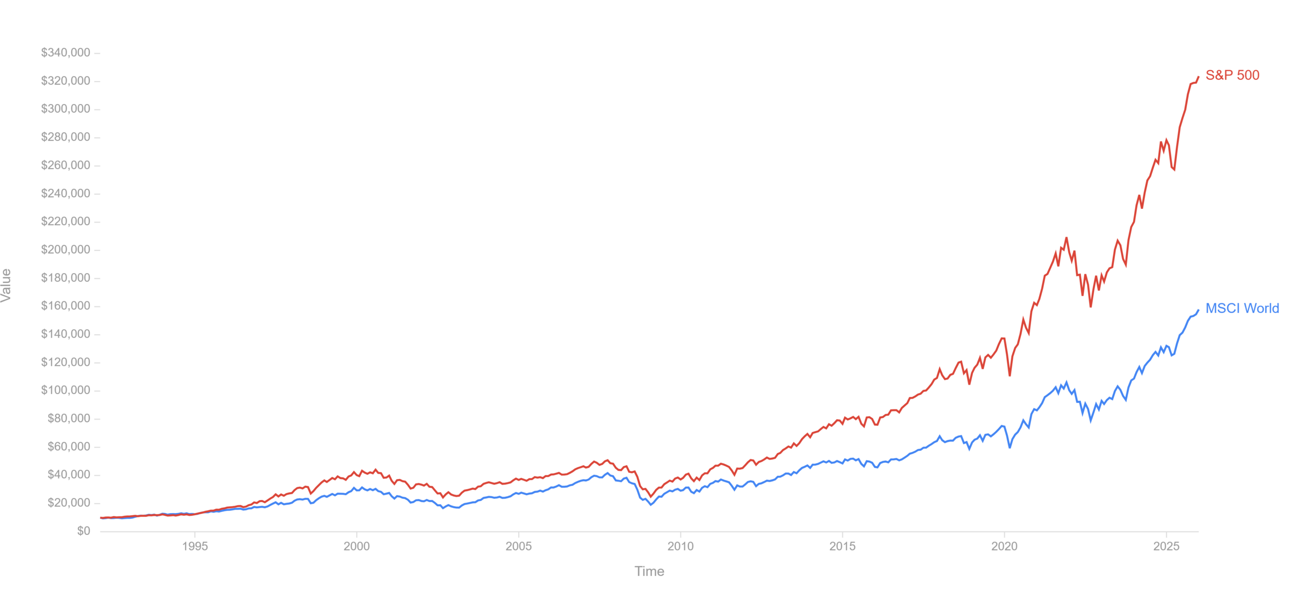 Cuando eso se convierte en dinero real, la diferencia es enorme: en ese mismo periodo, con el S&P 500 la cartera habría terminado con más de 150.000 dólares extra frente al MSCI World.